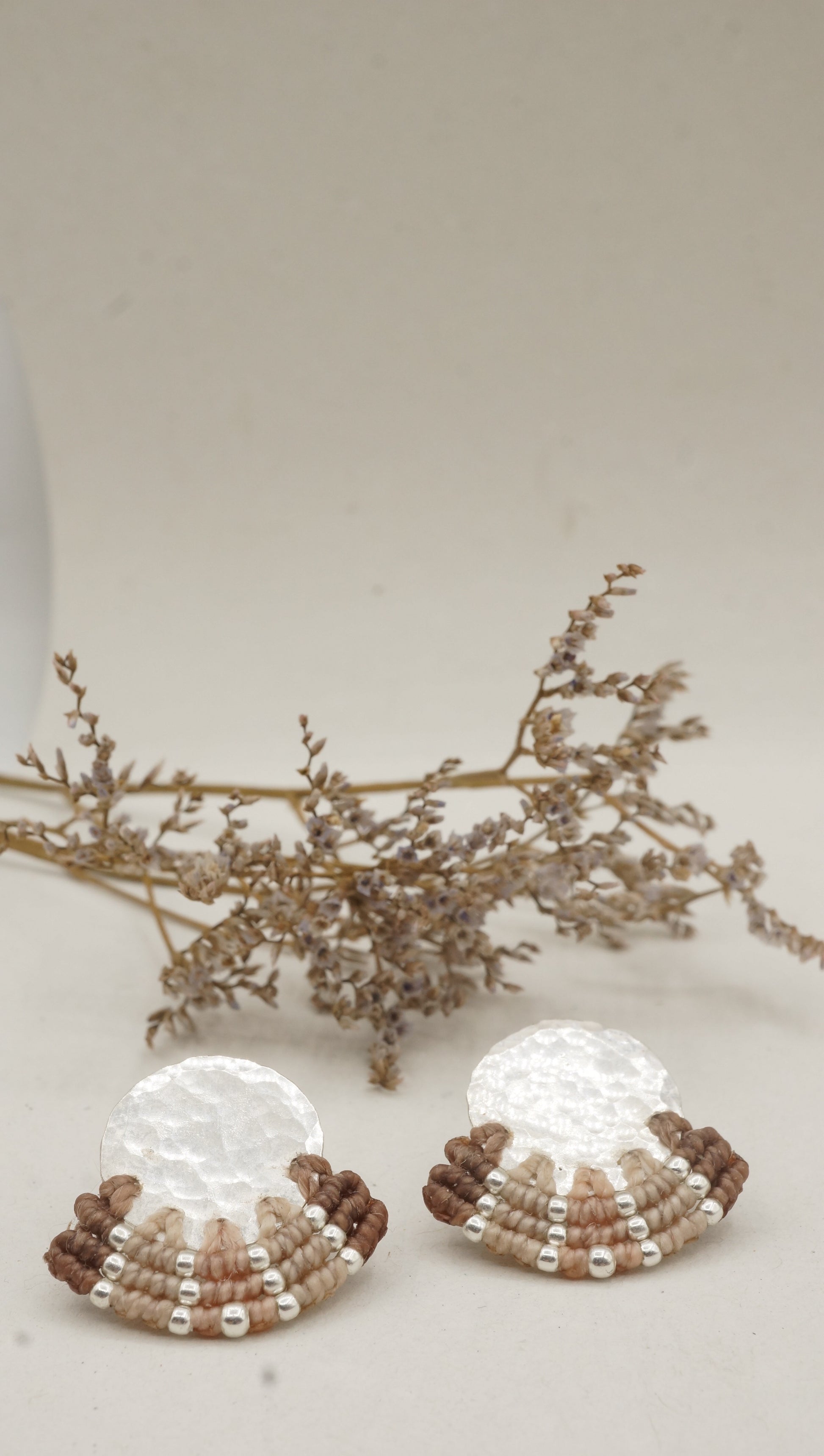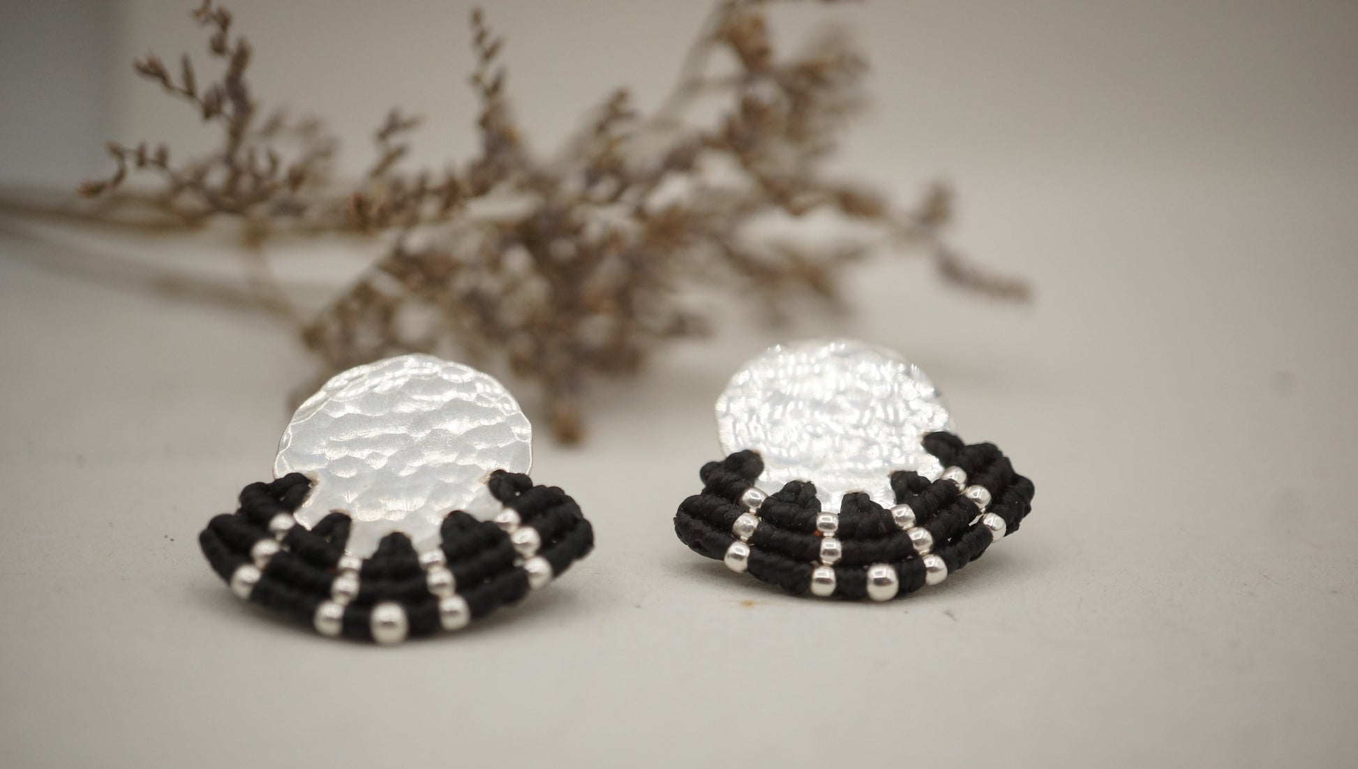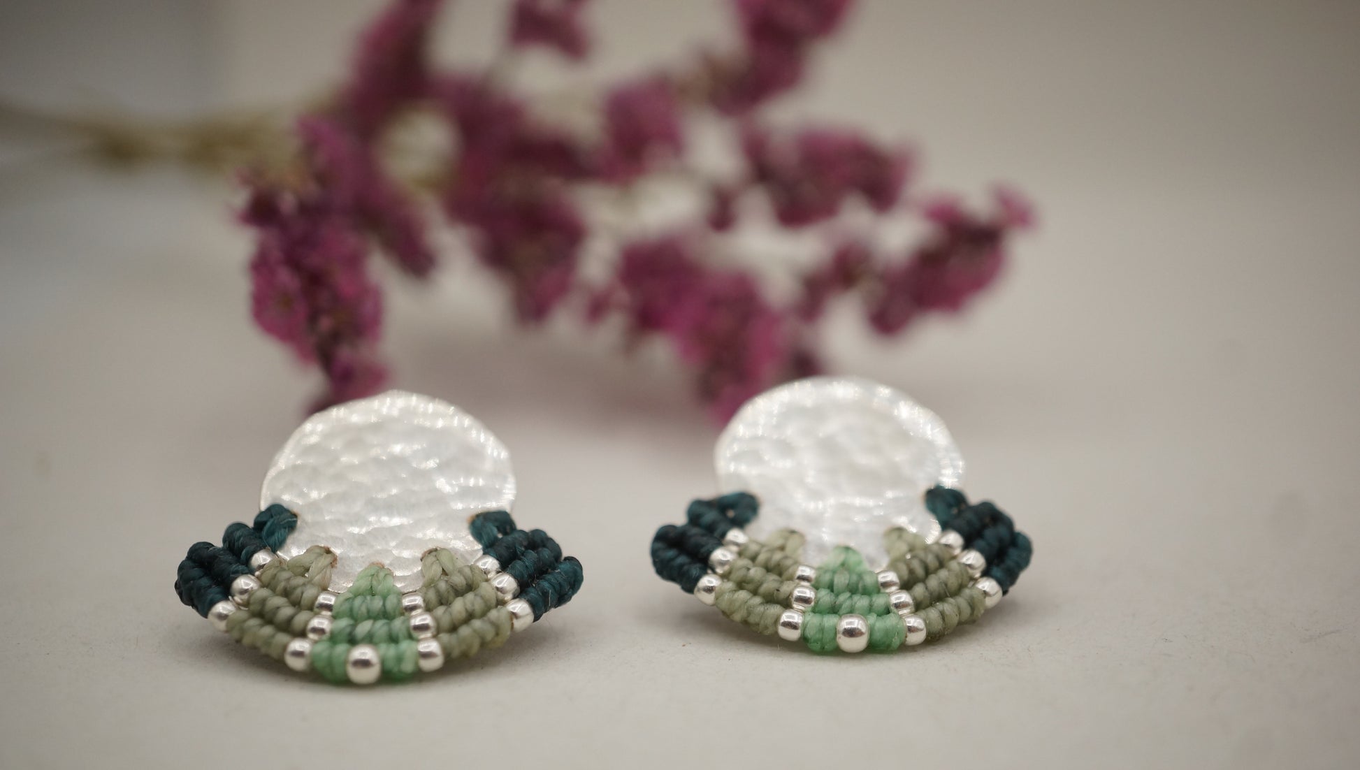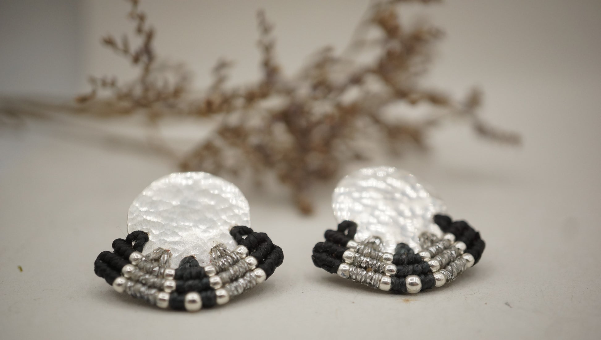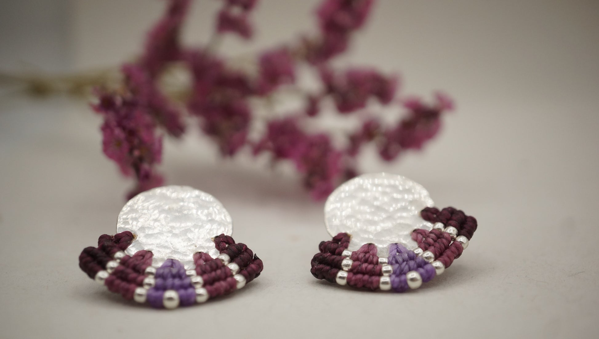 Aro plata 950 redondo con terminación en plata machacado. Tejidos a mano en macramé con intervención de mostacillas de plata.