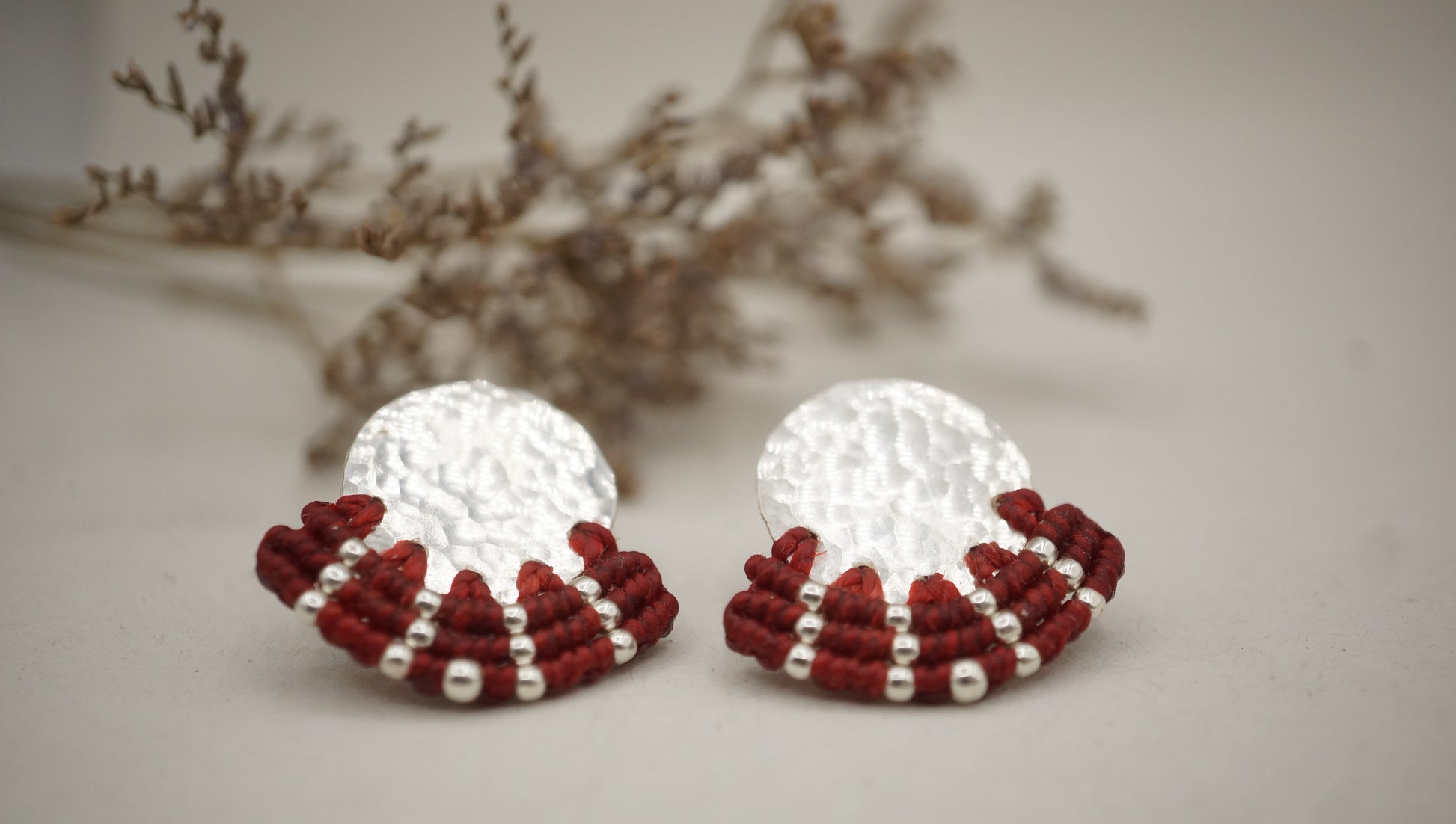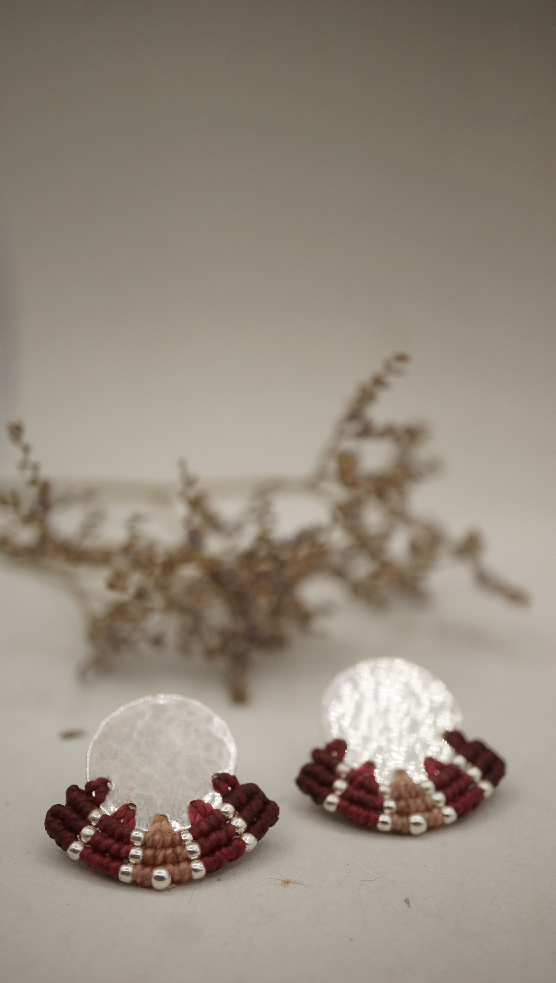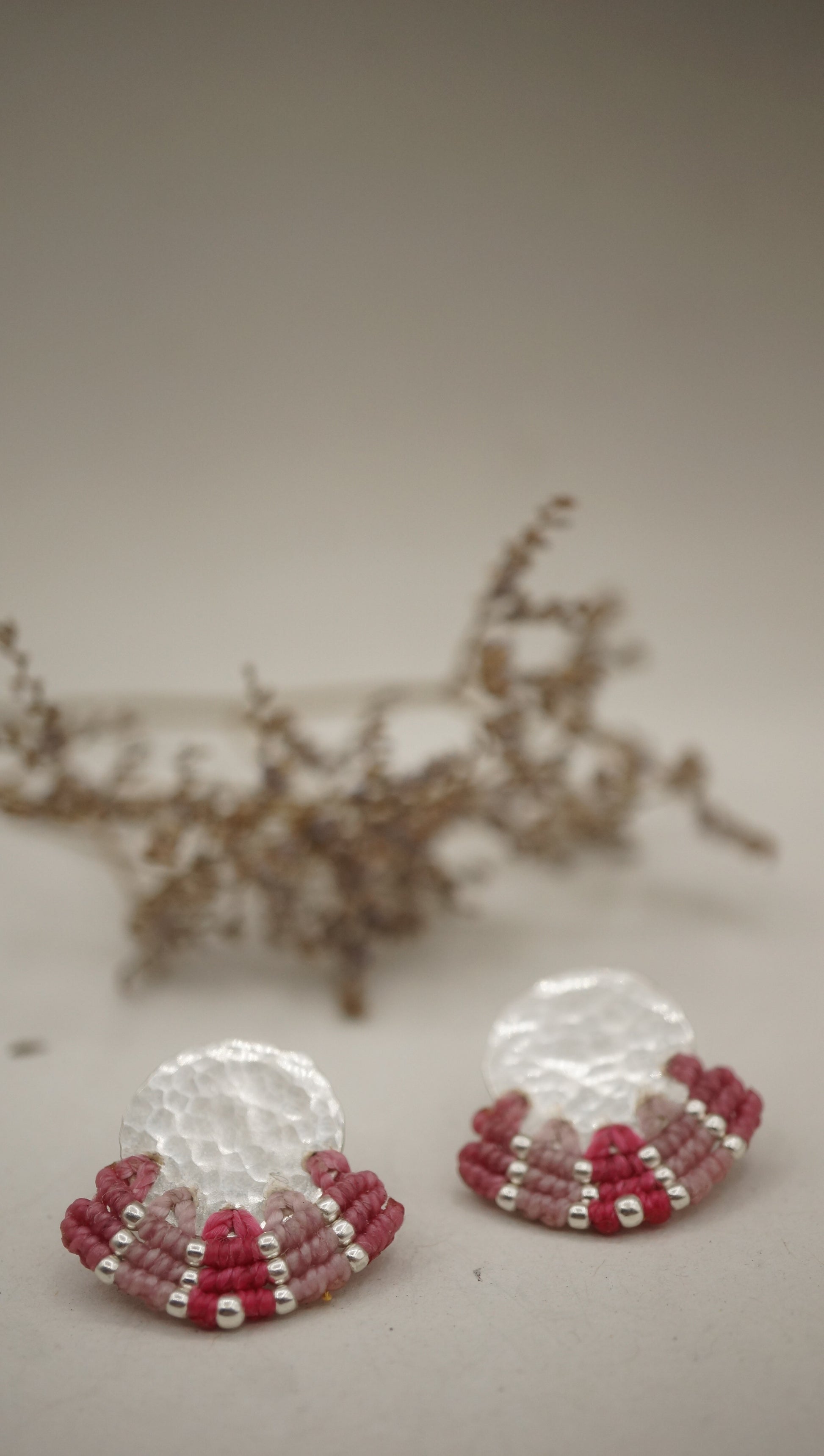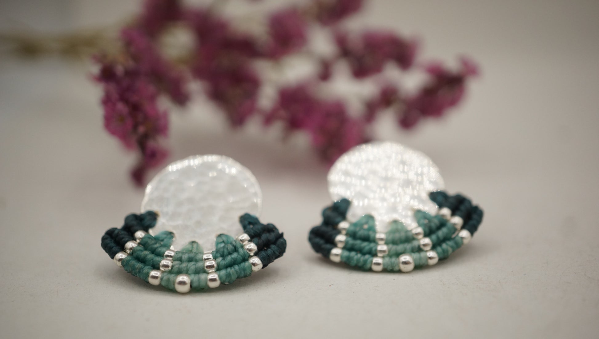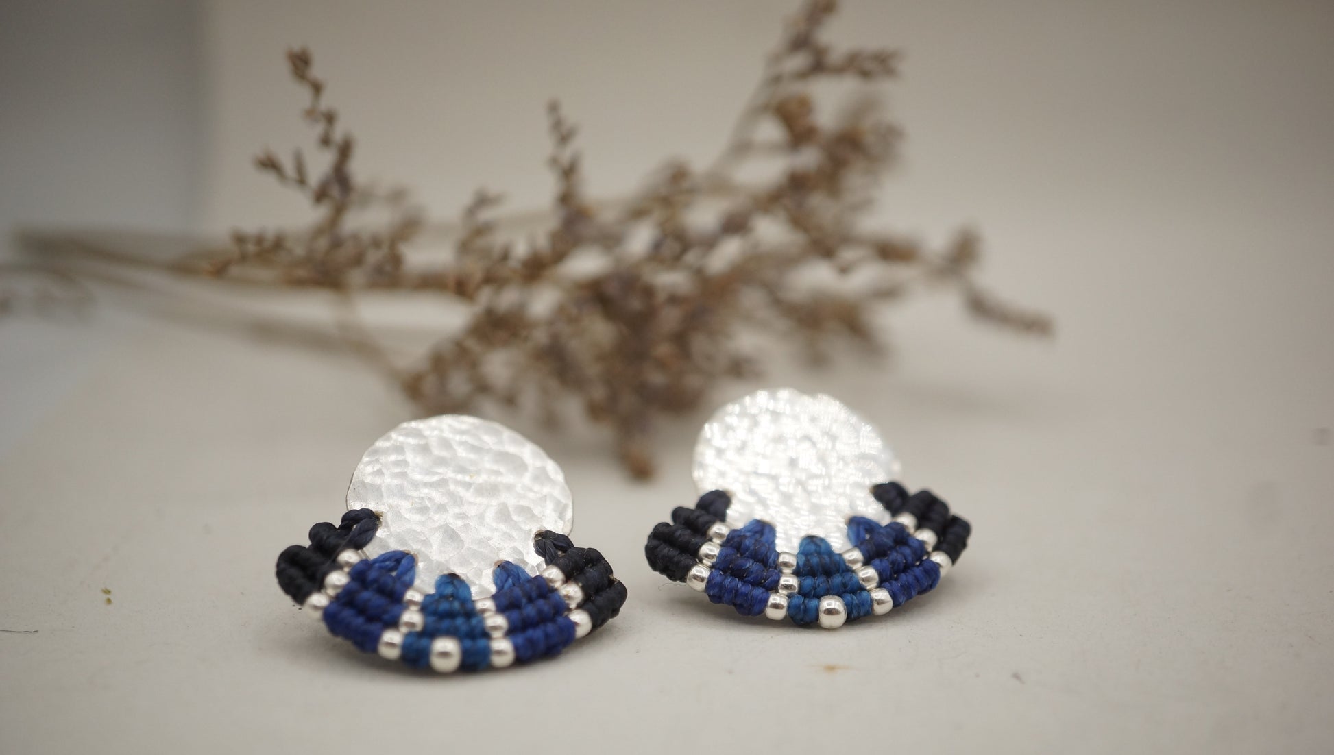 Aro plata 950 redondo con terminación en plata machacado. Tejidos a mano en macramé con intervención de mostacillas de plata.