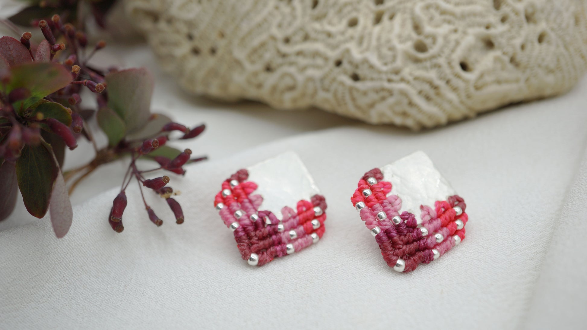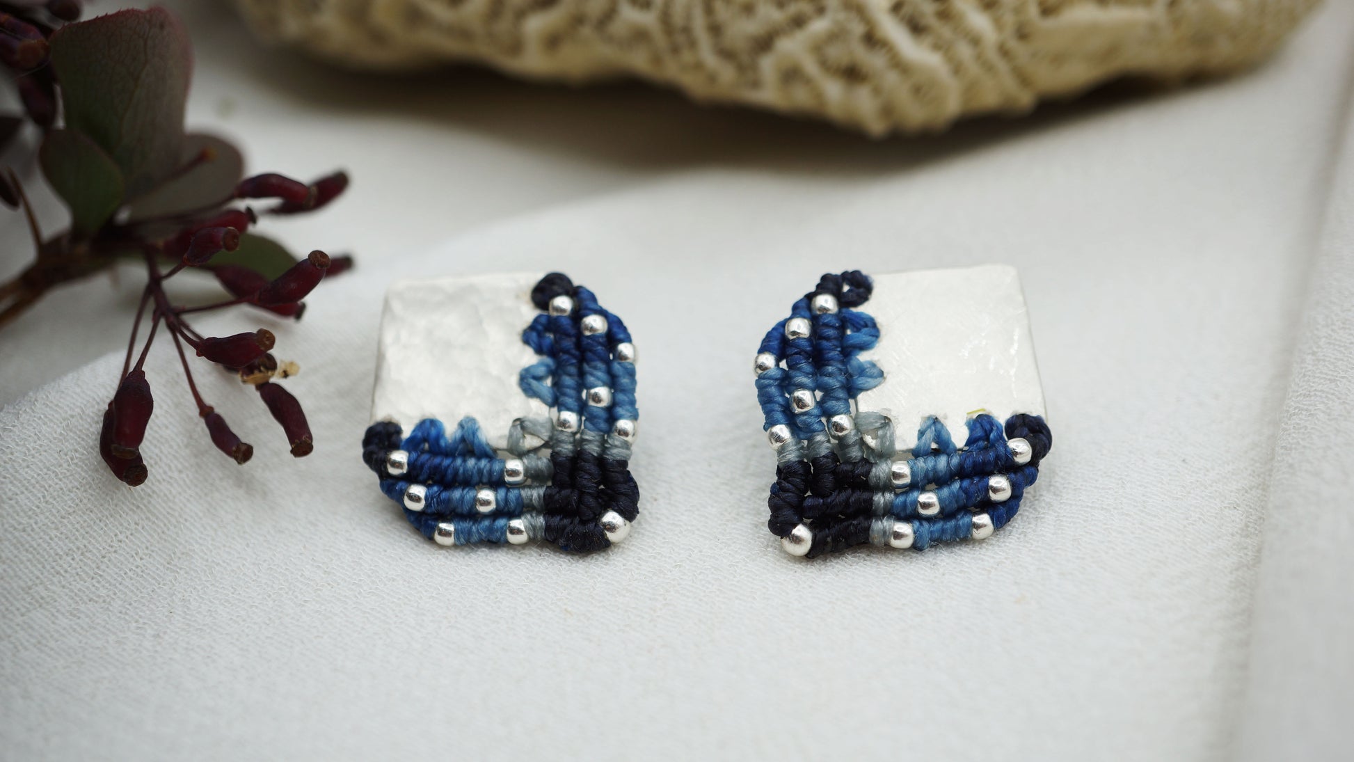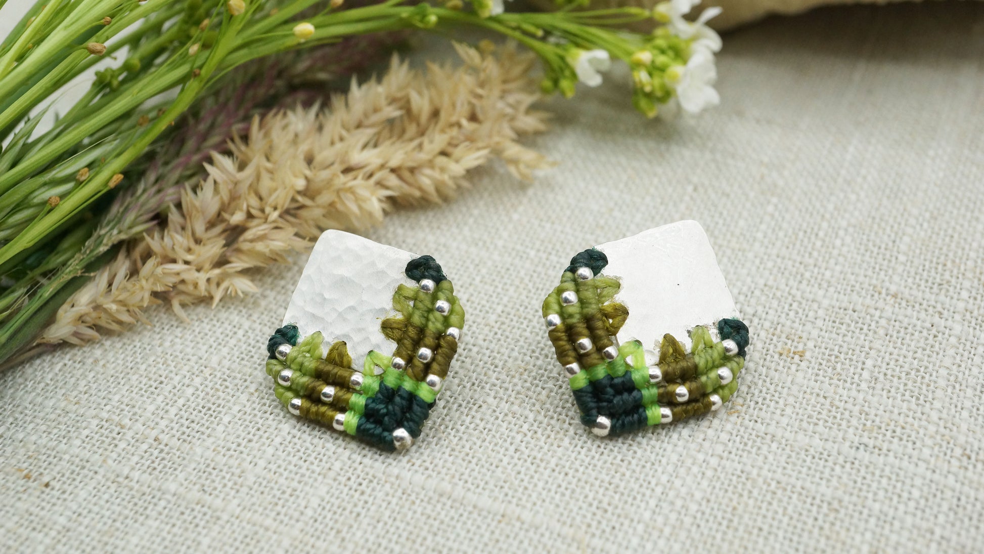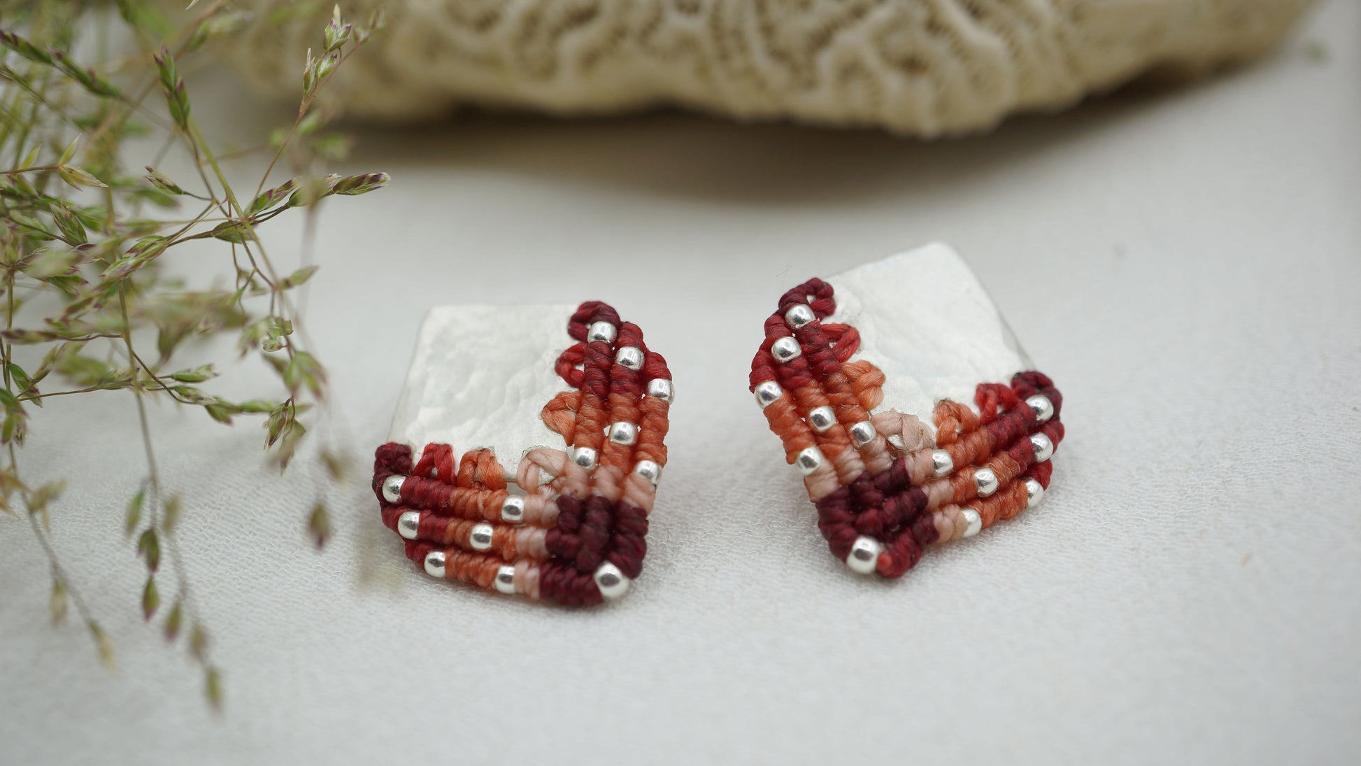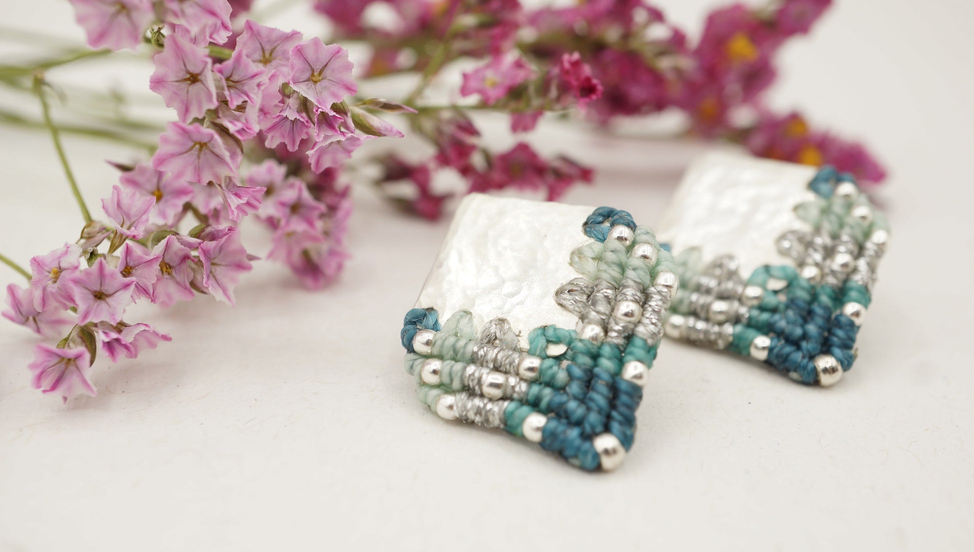 Aro hecho en plata en forma de rombo, tejido en macramé y aplicaciones de mostacillas de plata.
