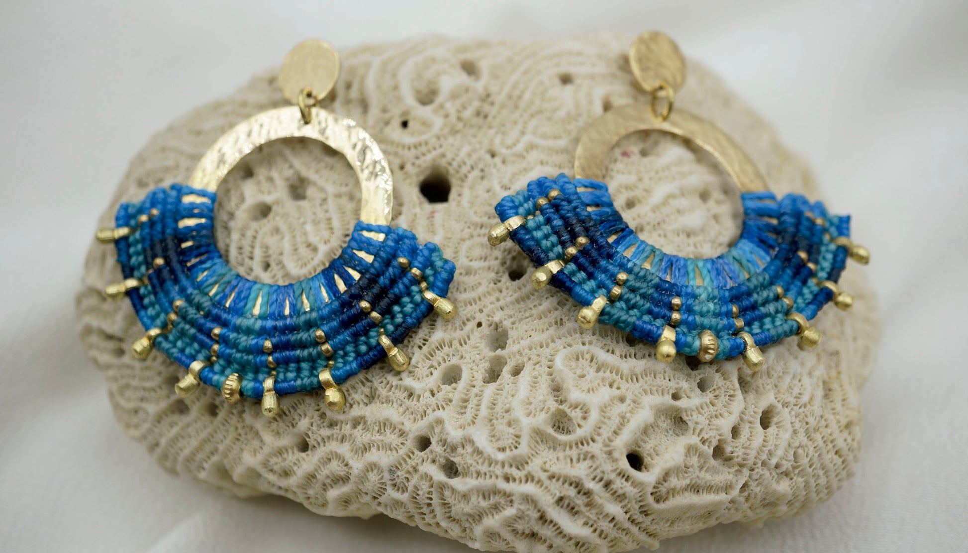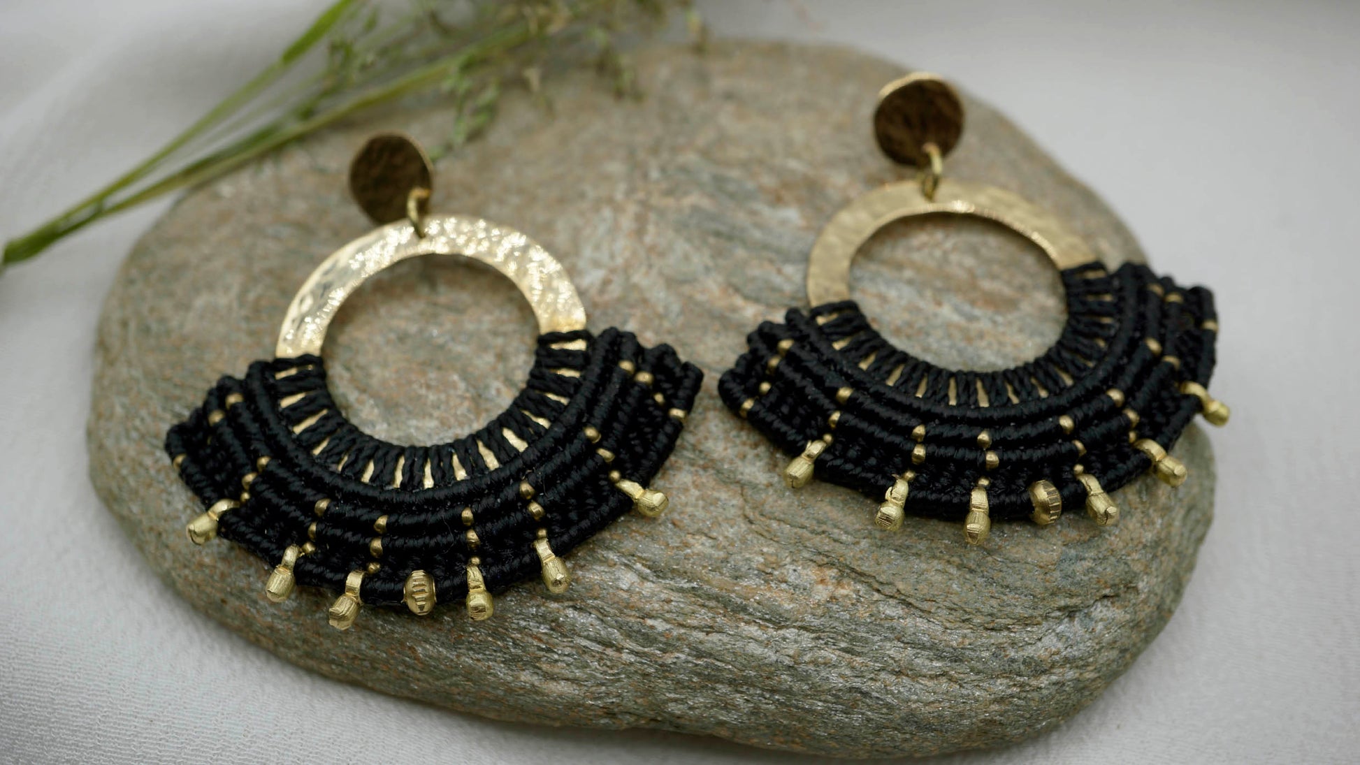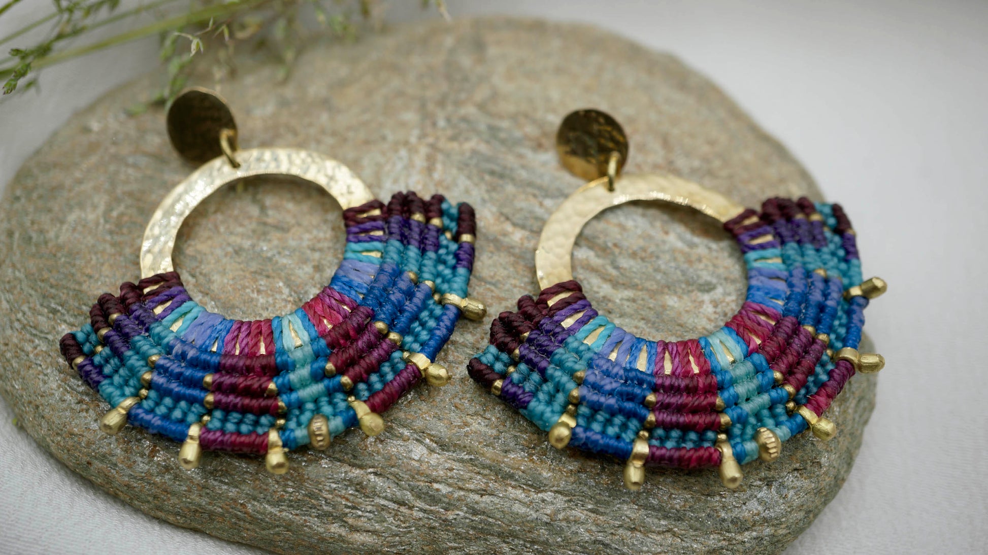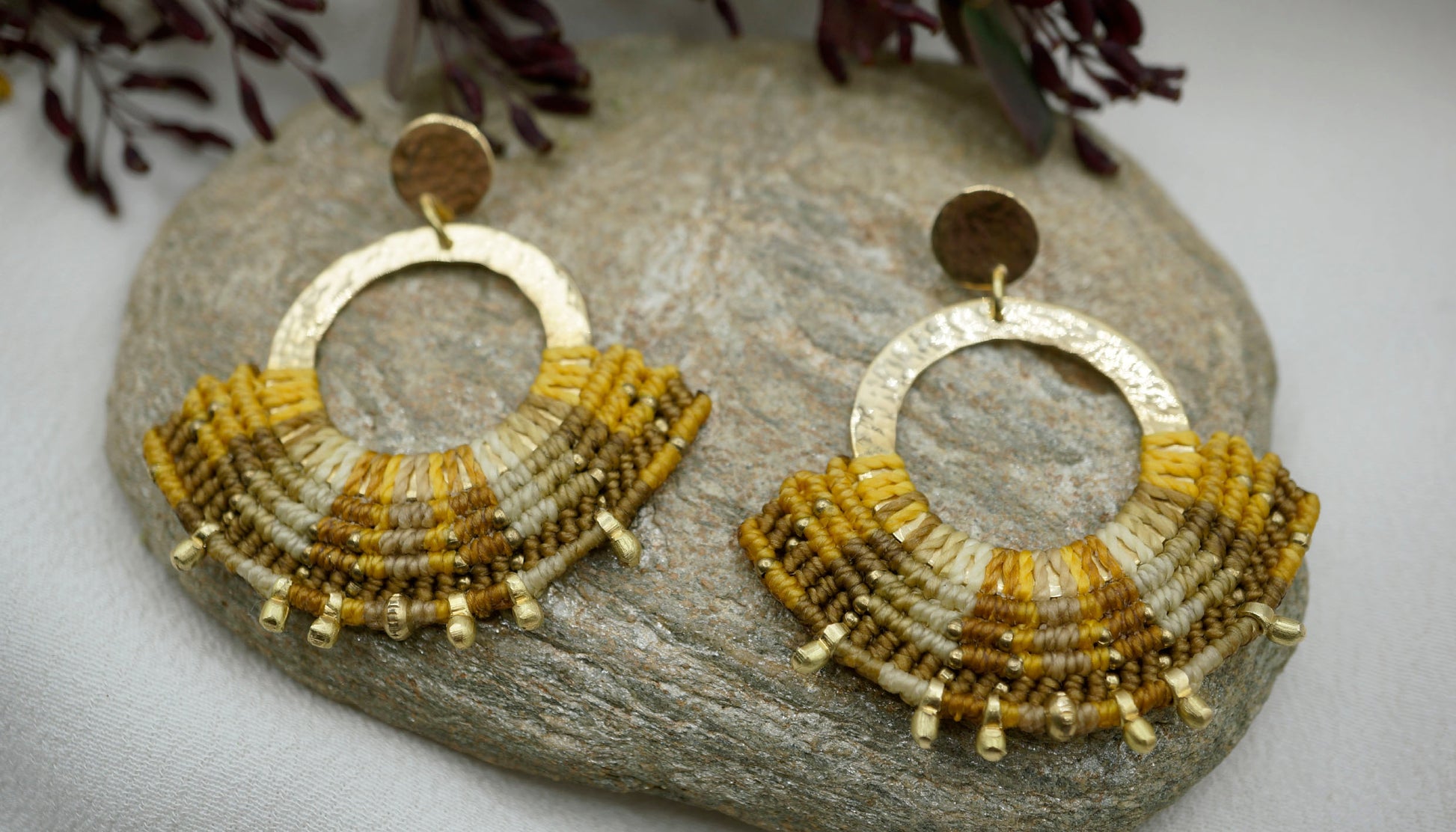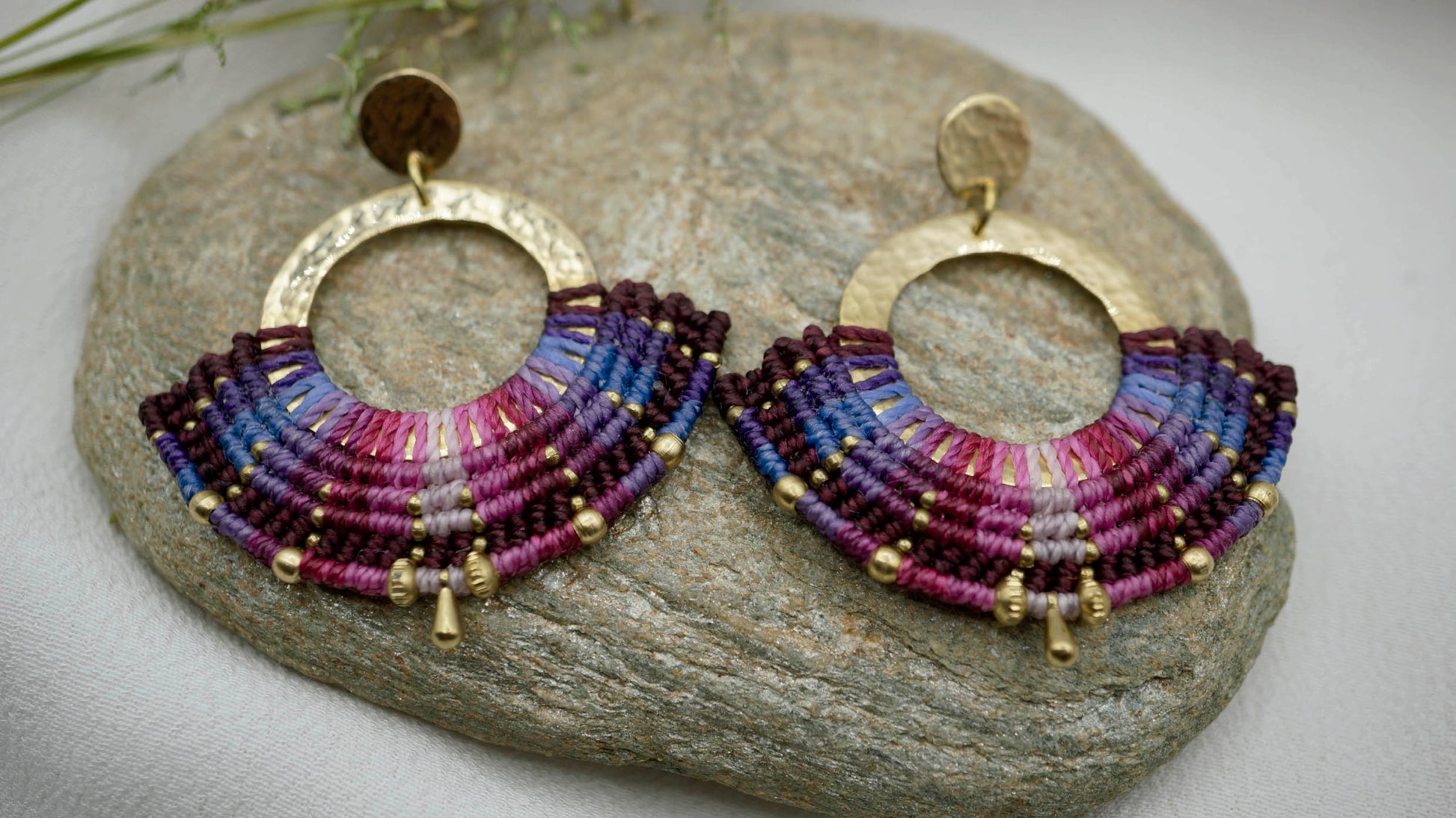 Aro de bronce tejido en macramé con intervención de mostacillas de Bronce. Este aro es liviano considerando el tamaño que tiene y pesa 3,5 grs cada uno (el par pesa 7 grs aproximadamente).